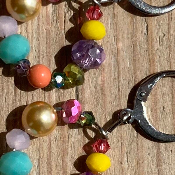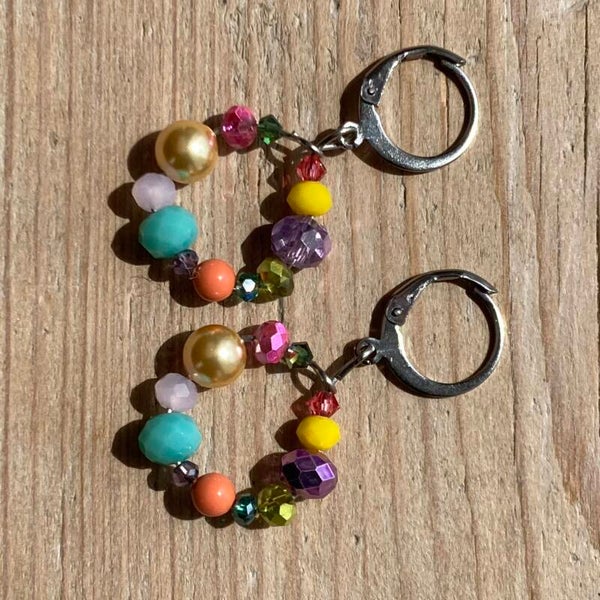 Zoektermen: kleur, kleurrijk, hoops, parel, oorbel, oorbellen, klein, rond, mooi, fun.