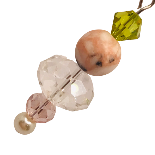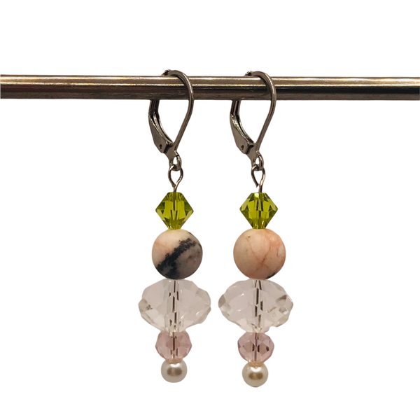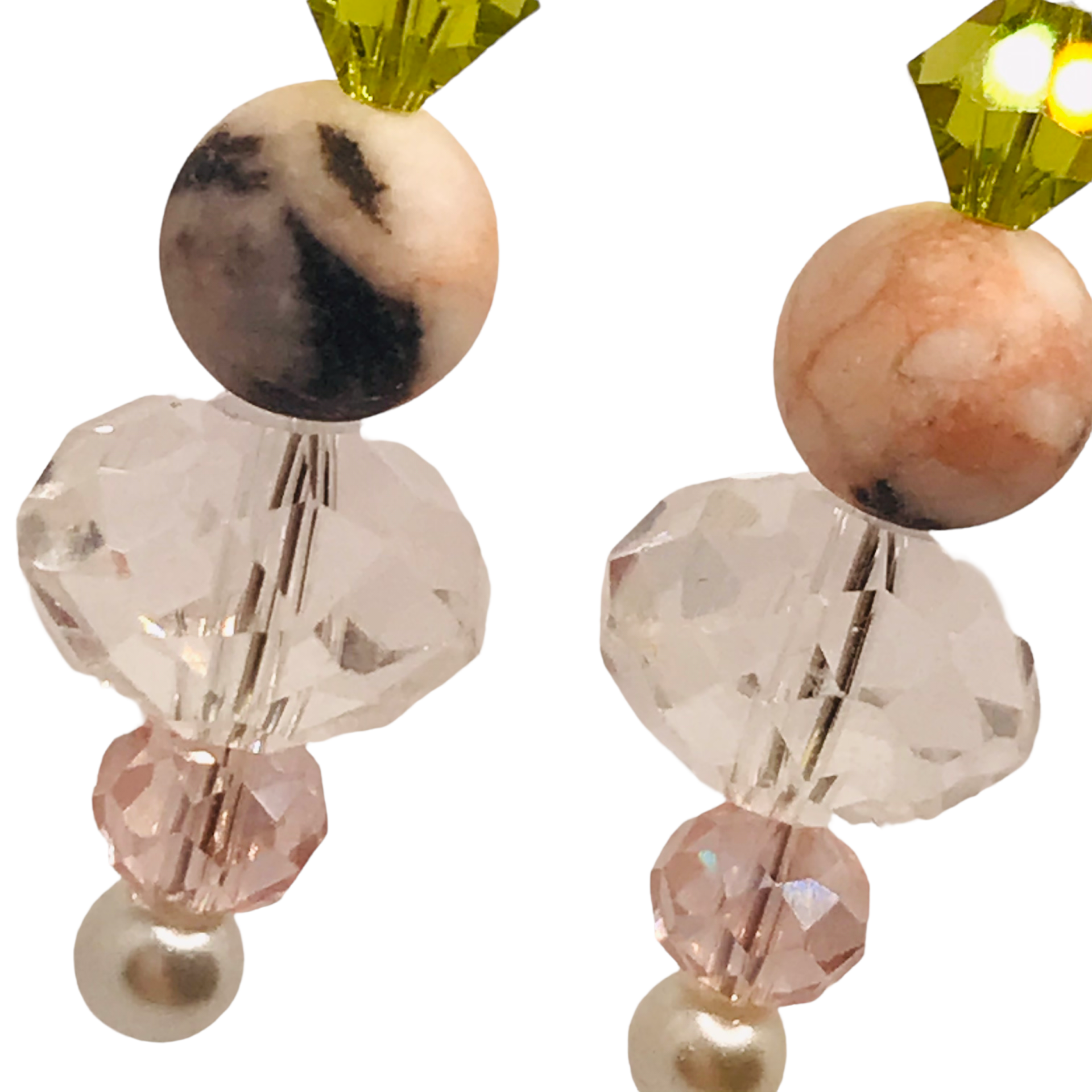 Materialen: Swarovski, pink zebra jasper, gefacetteerd glas, imitatie parel.