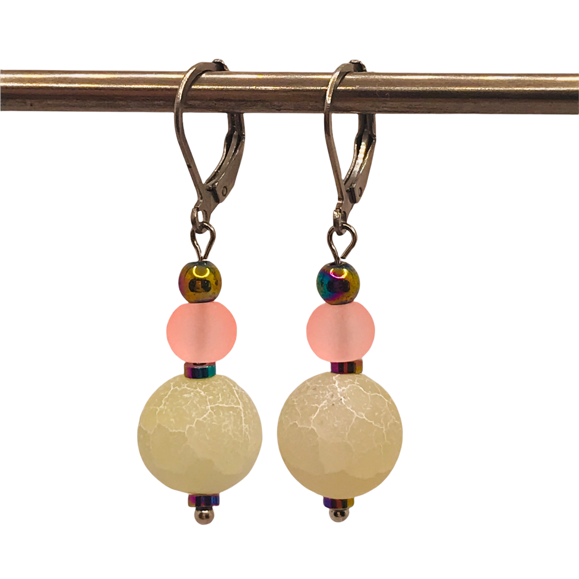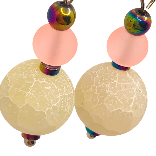 Materialen: gekleurde agaat, hematiet, frosted glas.