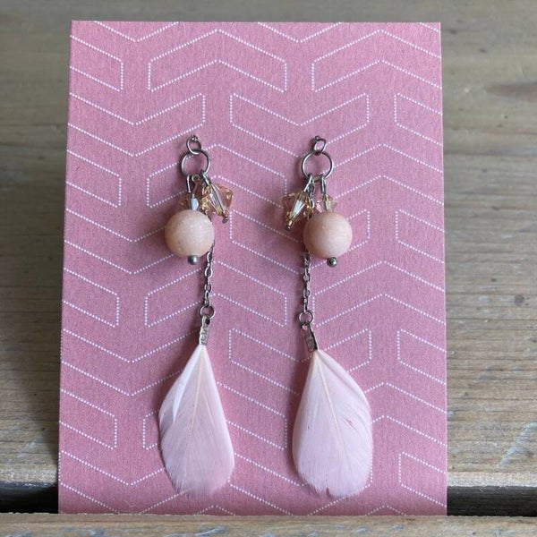 Materialen: Swarovski, natuursteen en geverfde veertjes. De kettinkjes zijn van metaal, de dangle drop oorstekers zijn van RVS, dus nikkelvrij en kleurvast.